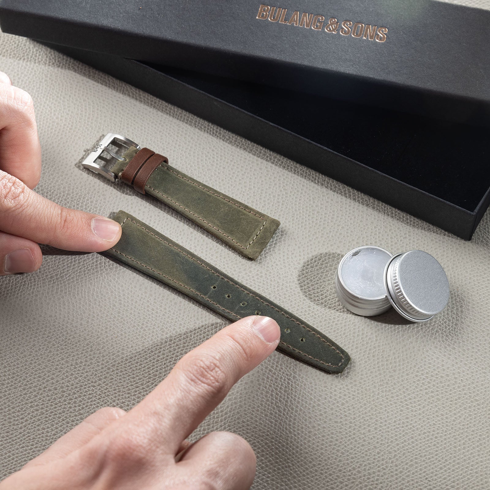 As vegetable tanned leather tends to shrink a bit when worn, all our leather watch straps are intentionally designed with a tiny bit more width to prevent them from feeling or looking too small after some wearing. When first installed with your watch, the strap might appear a bit snug – but after a while, it will stretch and fit perfectly between the lugs. For Bulang and Sons, this is a mark of quality and proof of our traditional and natural approach.